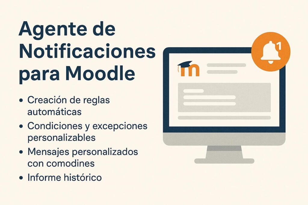 Notifications Agent es un plugin del consorcio UNIMOODLE que permite automatizar avisos en Moodle a partir de reglas configurables. Con él, administradores y docentes pueden enviar mensajes automáticos a los estudiantes cuando se cumplen determinadas condiciones.